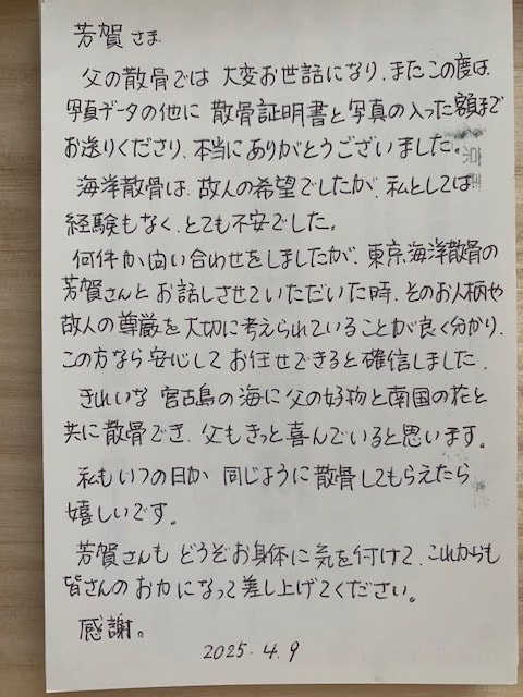 たくさんの埋葬方法がある中で考え迷い海洋散骨を選択する皆様のお役に立ちたいという一心で日々業務にあたっています。